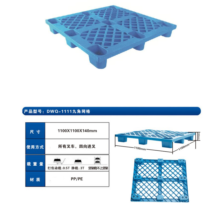 2、九腳塑料托盤(pán)產(chǎn)品選用高分子量高密度聚乙烯樹(shù)脂,經(jīng)擠出一次吹塑成型。成型過(guò)程快速、充分;產(chǎn)品成型飽滿(mǎn),內(nèi)在質(zhì)量和性能穩(wěn)定。